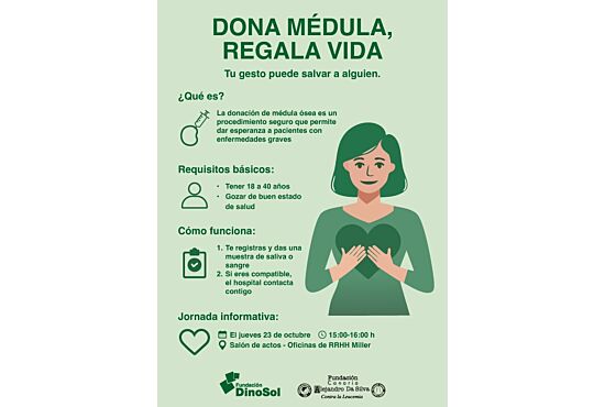 Desde la Fundación, su directora, Patricia Muñoz ha detallado que esta jornada está orientada en explicar, concienciar y aclarar dudas sobre el proceso de donación de médula. “Es un proceso médico que implica varios factores, desde la idoneidad del donante por su perfil, hasta la compatibilidad genética con el receptor o paciente. Desde la Fundación Dinosol somos conscientes de la importancia de este proceso médico. Hemos venido colaborando regularmente con la Fundación Alejandro Da Silva para intentar facilitarles medios que procuren por una mejora en la atención a los pacientes oncológicos que ellos atienden, a través de su red de servicios. Ahora, ha llegado el momento de dar un paso más y por eso hemos organizado esta jornada informativa para transmitir la importancia de convertirnos en donantes de médula ósea ya que con ello podemos salvar vidas”, ha indicado Muñoz.
